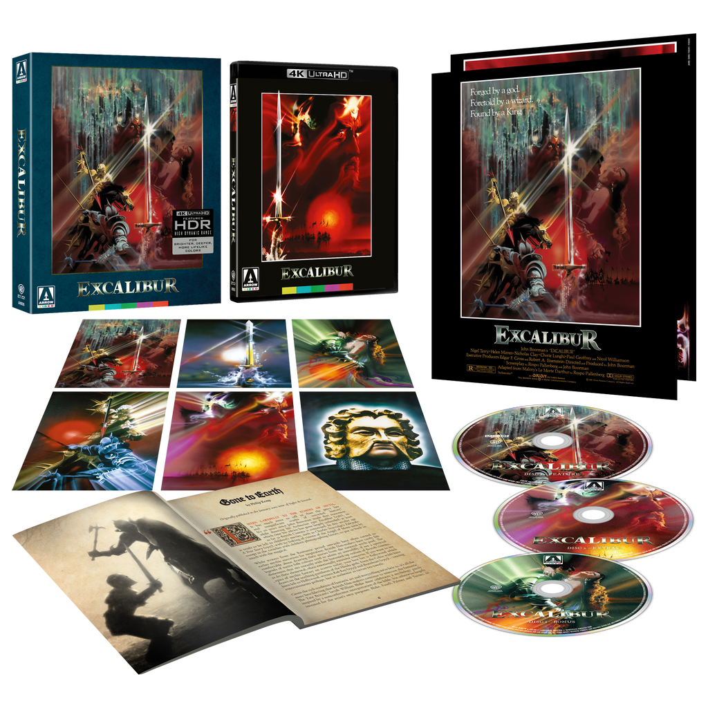 With an extraordinary cast that includes Helen Mirren, Gabriel Byrne, Nicol Williamson and Liam Neeson, Oscar-nominated cinematography by Alex Thomson (Legend) and a thundering score by Trevor Jones, Excalibur makes its Ultra HD debut in a stunning new 4K restoration. From the blood and mud of the battlefield, to the glowing green of ancient woods and gleaming gold of Camelot, experience Excalibur as you never have before.
