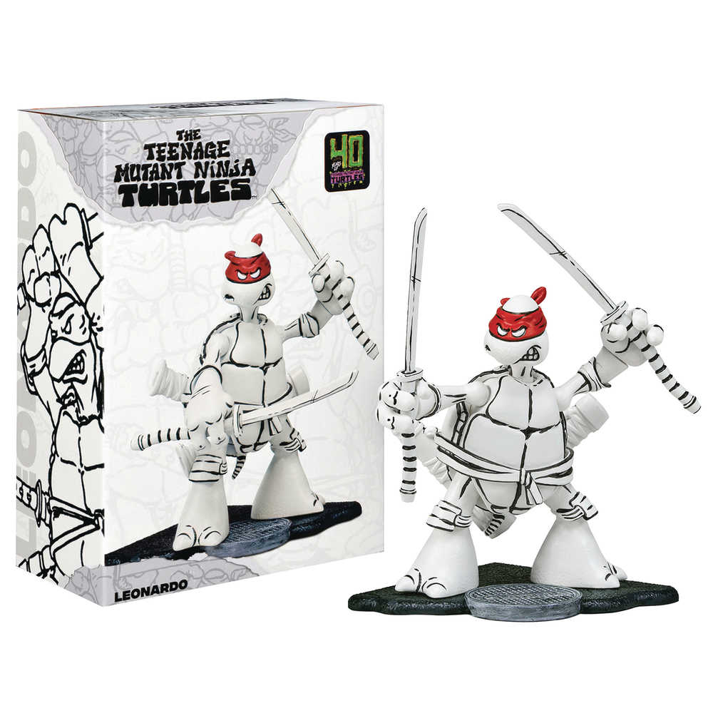 From Playmates. A PREVIEWS Exclusive! Shellebrating the 40th Anniversary of the Teenage Mutant Ninja Turtles. - Cowabunga! Discover the origins of the Teenage Mutant Ninja Turtles with this PREVIEWS Exclusive figure! Based on Kevin Eastman and Peter Laird's first group sketch, this highly detailed, black-and-white Leonardo figure comes with his signature weapons, a collectible sleeve, and a card of the original 4 Brothers sketch. This figure also include a base that can connect to others in the set to recreate the iconic scene, making this set a must-have for any TMNT fan!