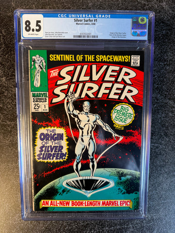 Silver Surfer #1 with a CGC grading of 8.5. Origin of the Silver Surfer, first self-titled series. Featuring the origin epic of the century! With cameo guest appearances by the Fantastic Four, the Incredible Hulk, and the gargantuan Galactus! A brand-new smash hit, starring the most dramatic hero of all time – in an adventure as big as outer space itself!